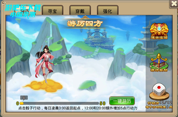 1、游历:玩家可以操作骰子,每点一次,玩家就跟着骰子的点数移动,游历会碰到各种有趣的事件,有的会送法宝、有的会送神兵、有的会送行动力,当然也有什么事情都没有发生的事件。行动力是游历必须消耗的资源,每个小时可以恢复一点,每天凌晨3点玩家会返回起点,在12:00和20:00会额外增加5点行动力。
