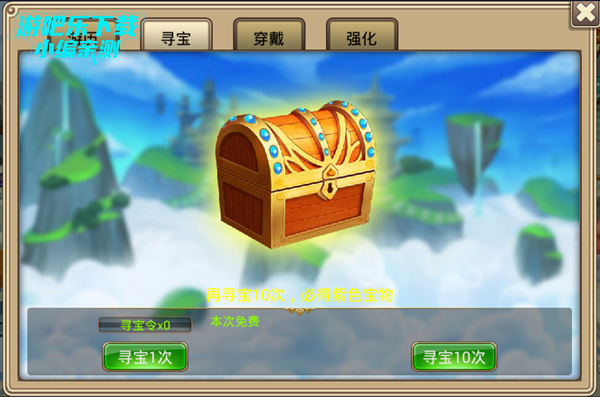 4、寻宝:分寻宝1次和寻宝10次,寻宝会消耗寻宝令,或者可以消耗250元宝,而且每48个小时会免费给玩家寻宝一次,寻宝10次后必得紫色宝物。寻宝10次是方便玩家多次寻宝,快速找到自己需要神兵和法宝