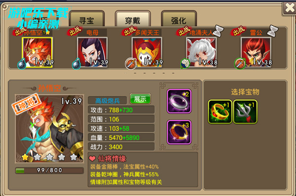宝物即神兵、法宝,相当于一种特殊的装备,宝物系统是塔防西游记里面最有趣的一个玩法之一,他包含了三部分的内容:游历、寻宝、穿戴强化。