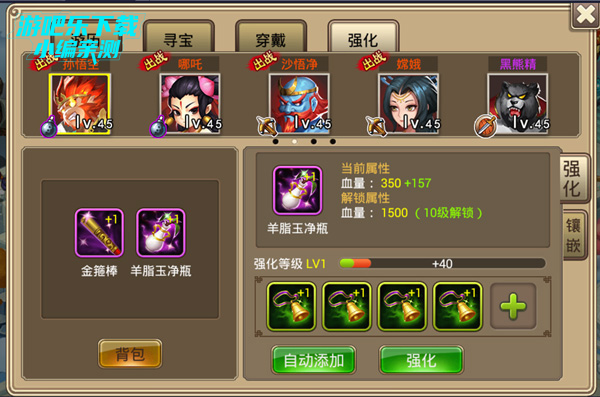 装备要跟着主公的等级来强化,前期资源有限,所以跟晋级一样先强化部分仙将的装备。当你过不了关的时候就可以回头收集材料、图纸,打造更强的装备后,过关就没难度了。