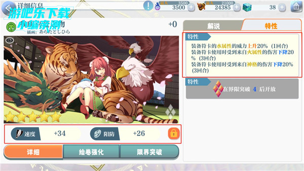 点开绘卷的特性之后我们就可以看到这里记录着这个绘卷所能带给符卡的属性加成,左边是基础属性,右边的特性是战斗中的特殊效果