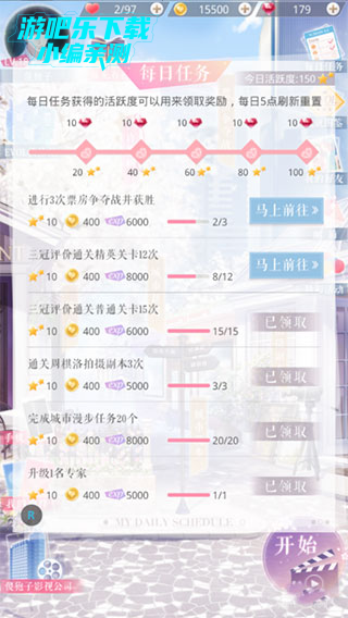 每日任务:尽量所有的任务都要完成。不仅可以获得大量的经验(公司升级)提升公实力,还能获得金钱(普通抽卡、专家升级、羁绊升星、进化都会用到)更能获得钻石(每天可以获得50钻石)无论是抽卡还是购买别的东西(体力、胶片)都非常的有利。