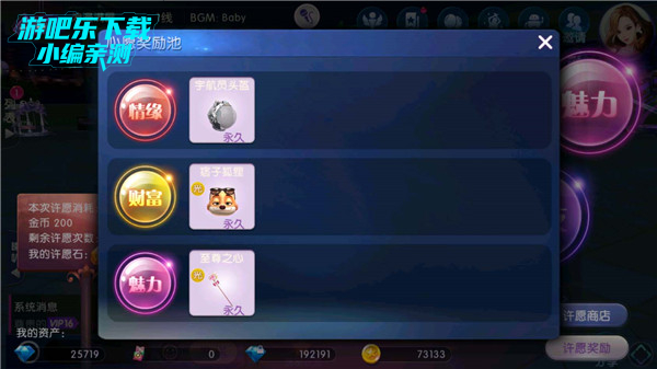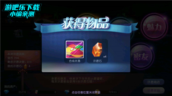 玩家们每人每天有3次许愿机会,直接点击许愿类型便会自动开启许愿仪式,许愿完成后,玩家们便可获得许愿石或者不同类型对应的神秘奖励,每次的奖励都是随机的,界面左下角还会显示我们目前拥有的许愿石数量以及当前许愿消耗。