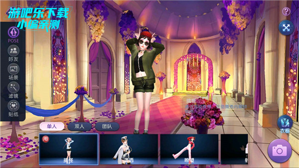 进入系统后,首次点开的玩家会看到【劲舞秀】的使用说明,浏览完引导后,便可开始真正的【劲舞秀】之旅了!在左侧的菜单栏中,玩家们可以依次看到“POSE”、“好友”、“场景”、“滤镜”、“贴纸”按钮。在“POSE”页面中,可以切换单人、双人以及团队拍照姿势,滑动下方的图片可选择更多姿势!另外,直接拖动人物便可调整人物的站位。