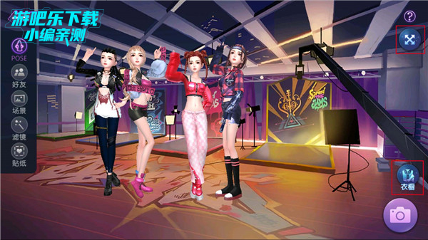 除了左侧的菜单栏外,右上角的“锁定”按钮也大有用处。点击该按钮后,便可隐藏页面下方的的浮动面板,锁定一切功能。只有再次点击该按钮,才可打开浮动面板,进行其他操作。而点击下方的“衣橱”按钮,便可进入到自己的衣橱,更换自己喜爱的服装。另外,未解锁的POSE、场景、滤镜以及贴纸,可以通过“许愿池”获得。