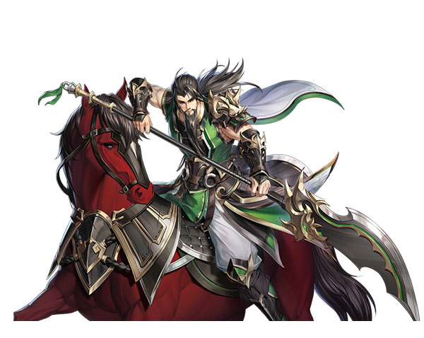 雄虎之将。与刘备、张飞桃园结义,情同手足。立卧蚕眉,横丹凤眼,提青龙揠月刀,剑气凌云,斩五关过六将,温酒斩华雄,水淹七军威震华夏。后大意失荆州,败走麦城。