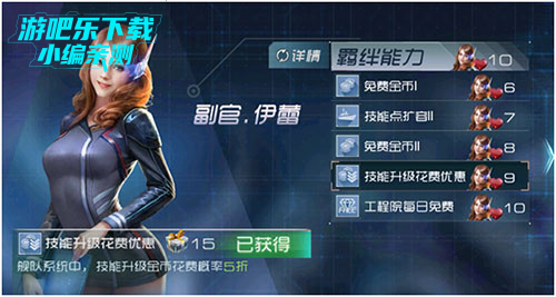 然后把指挥部----副官。伊蕾的羁绊能力学满,其中第9级的技能升级花费打5折,这个保证你可以发展一个副舰队,第10级的工程院每日免费都是重中之重。