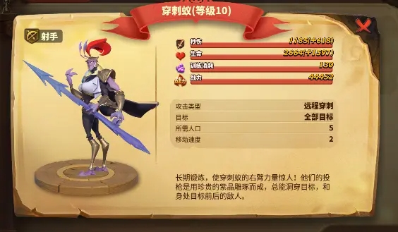 4、【觉醒技】斩草除根 lv .3/3 当被[怒目凝视]所锁定英雄生命值在20%以下时,下次普攻将尝试直接将目标击败(每场战斗最多可触发一次) ,配合穿刺蚁部队。可以给敌方英雄带来毁灭性的打击。