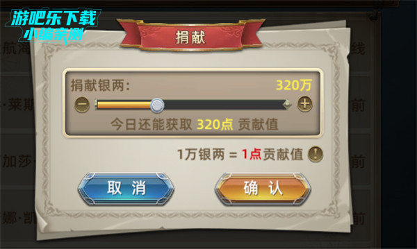每天在联盟内捐献银两,可以获得相对应的联盟贡献,但每天捐献银两获得的联盟贡献是有限的,每当联盟等级提升时,每天能获得的联盟贡献也会略微提升。