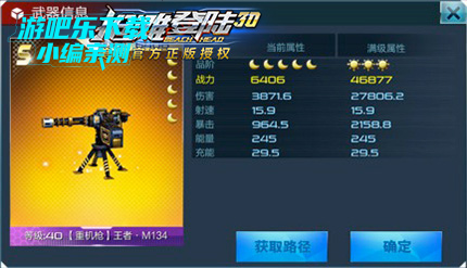 重机枪的推荐配置——王者·M134,绝对是土豪身份的象征。它不可以通过消耗钻石或者其他任何方式来获得,只能是在达成VIP7时,通过超值礼包中开出。而且,王者·M134的培养方式基本是依靠万能碎片和王者碎片,可谓是土豪的专属。但是,与价值相匹配的,是它惊人的属性,满级46877战力、27806.2伤害、15.9射速、2158.8暴击,绝对能在战场上轻松撕裂任何敌人。