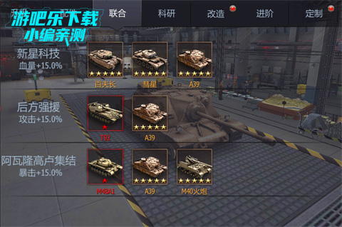 一般情况来讲,我们会习惯性地将战斗力、星级更高的坦克排入阵容,但这样其实并不一定能发挥出最好的效果,因为在游戏中存在坦克之间的联合技,也就是说上阵指定的坦克组合,便能激活属性加成的效果。