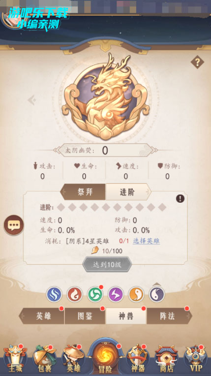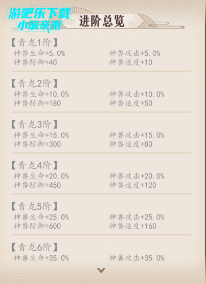 3、神兽每10级可进阶1次,进阶消耗相应系别英雄及神兽碎片,神兽碎片可以在神兽神殿对应的种族圣殿中通过或扫荡获得。进阶后额外提升神兽百分比属性