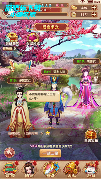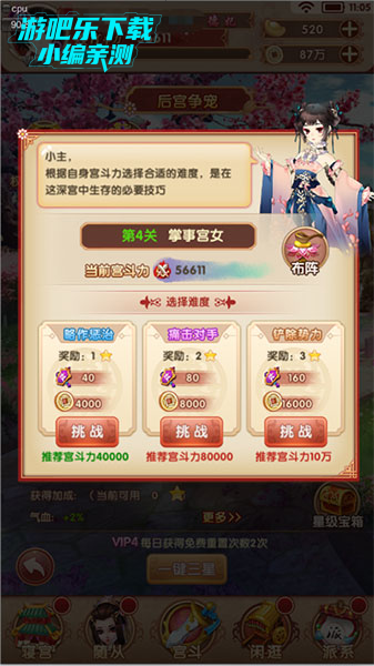 进入争宠玩法后,可在主界面查看到多个按钮。装备商店,奖励预览,星级宝箱均与此玩法的奖励相关,稍后再详细介绍。3关为一个大章节,点选界面上的人物形象即可进入战斗选择场景,建议玩家选择与自身战力匹配的挑战难度,不同的难度可获得的权势值,金币以及星级数都不同