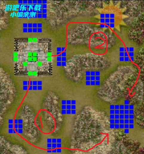 本关考验玩家的输出能力。第二回合刘感死后走剧情,显示要求守城至秦王入城。第四回合李世民大部队赶到。前十回合的主要任务是守城以及清兵,不能出城。可以让一个人站在红色方块守正门,建议李世民或者令箭枪兵,其余人全部往左侧以及左下靠拢,同时加好强行,准备第十一回合出城。蓝圈部分会有无限复活的破甲副将,只要让红色方块处的人别杀死他们就行,让他们在城门罚站。红圈部分各有一波伏兵。本关MVP是刺客套侯君集。侯君集可以直接进下城切医生。此处有个小技巧:下城城外的boss可以等侯君集进城触发伏兵后再杀,这样就不用杀第二次。上城城外的boss要先杀掉才会触发城内伏兵。下城清完后立刻出城杀小薛。上下城都清完后城门口的兵不会复活,下城的人再杀上去就好。全灭无撤退奖励祝融巾。二周目全灭过关奖励柴绍成长点,有皮肤再额外奖励两点。