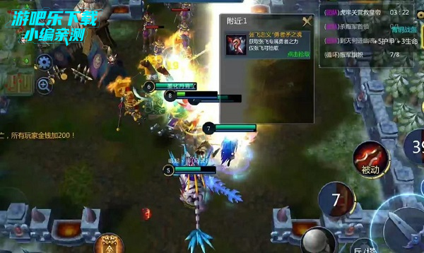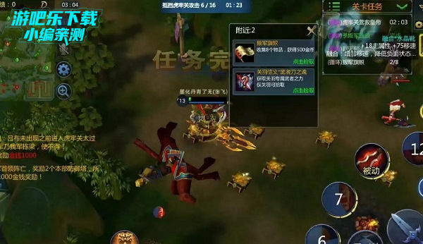 三英阵容打法:首先还是迅速出装,各处箱子中的物品不要忘记去捡。一开始浦沅夏侯跟随刘备攻破第一个敌方据点,而关羽在上面打树人升级,张飞在下面打旗子发育。期间叛军首领会掉落关羽专属武器,不占格子。接着第二个据点,击杀朱俊张飞的专属武器掉落。关羽发育完之后前去跟大家会合推据点堵门防守,张飞则是负责击杀版军首领,何进,斗魔,之后再和队伍会合。