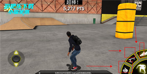 2、右边这个是抓板动作,按住不同方向和抓板可以组合成不同的抓板动作,也可以用于空中抓板,能够大幅度提升获得的分数