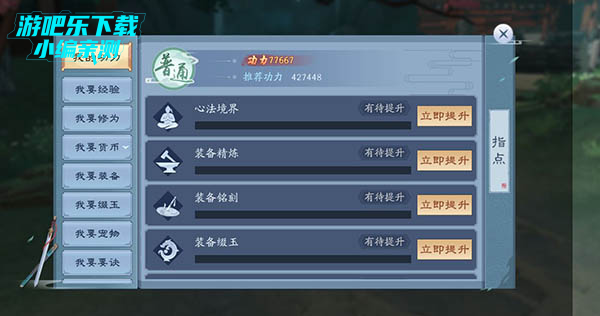 游戏内有丰富的功能可以使少侠变强,例如精炼装备、培养宠物、修炼技能等。除此之外,少侠若有任何成长方面的疑问,都可以点击上方“小风车”按钮,再点击“指点”,变强的方法都在里面了