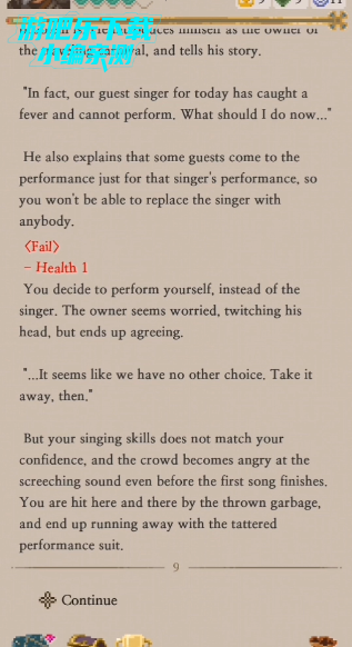 - 这款游戏的美术风格非常独特,像素画面充满了复古情怀,场景设计也十分用心。游戏流程轻松愉快,但又不乏挑战性,各种选择和结局让玩家体验到不同的游戏乐趣。虽然是文字冒险,但丰富的游戏内容和可玩性绝不逊色于其他类型的游戏。值得一玩!