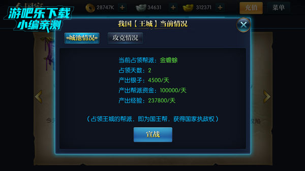不同的领地有不同的帮派资金,银两,经验产出,拿下王城就可以成为一国之主。将军们,战斗吧。
