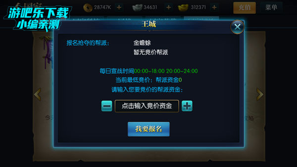 帮主可以选择宣战资金,最终的抢夺资格由竞价资金第一第二获得。除了王城还有其他领地可以供将军选择。