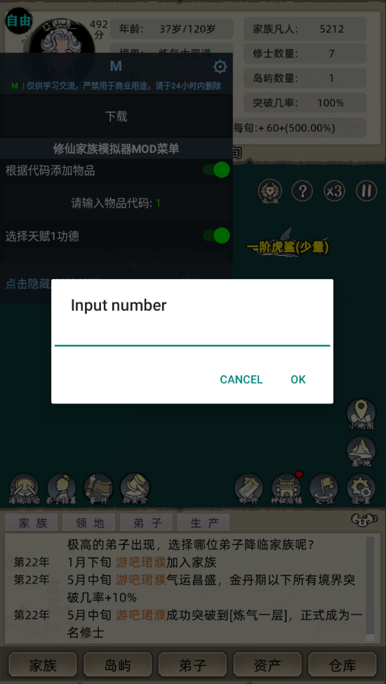 这边这里为大家整理了多款好玩的修仙家族模拟器破解版本,包含了修仙家族模拟器折相思破解版、修仙家族模拟器星联破解版、修仙家族模拟器折相思、修仙家族模拟器粗暴版,更多好玩的版本等你来享,赶快加入进来下载体验吧。修仙家族模拟器代码使用方法1、打开游戏进入以后点击左边的这个mod2、输入对应的代码就可以了。3、这个时候会弹出一个对话框,不过不用担心,直接点击OK就可以了。修仙家族模拟器代码大全最新序号