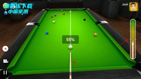 6、选择台球摆放位置后,点击右下角的对钩图标确认,用手指拖动右侧的“力度条”调整击球力度与角度,松开手指后,球杆将精准击球,台球应声而动。