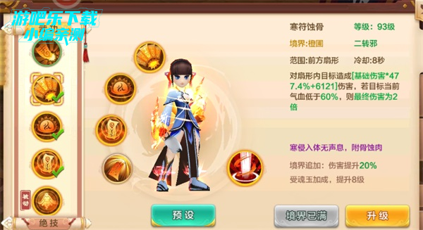寒符蚀骨:邪符斩杀技能,对气血低于60%的当前目标造成的最终伤害为2倍。且配合气功蚀骨侵神,更可起到控制作用。