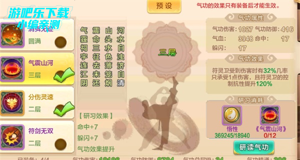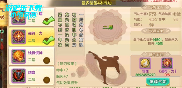 一转气功需要加满的技能有护身罡气,满级可以提升我们50%的防御力,因为剑客回避属性比较高,搭配上这个表现会十分的出色。