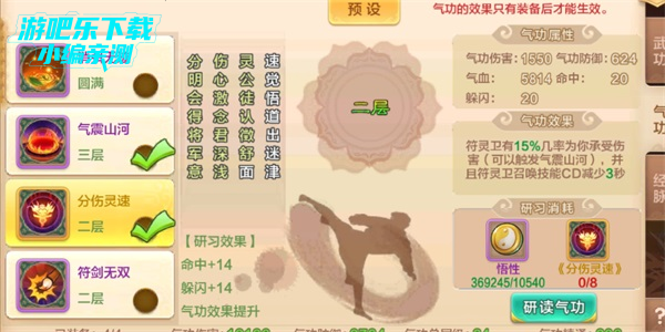 分伤灵速:符灵卫(召唤物)有几率为你承受伤害(可以触发气震山河),且符灵卫召唤技能CD减少。配合气震山河大大提升角色和宠物的生存。