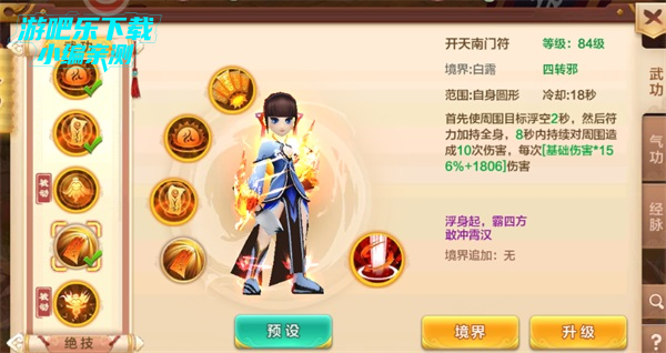 开天南门符:必带技能!控制技能,高伤害持续输出技能。使用地煞灸免符后使用。因为是持续伤害技能,所以需要状态加成。