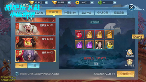 BOSS系统是九灵神域的核心玩法之一,玩家将通过不断击杀 BOSS 获得游戏资源从而提升自己的战斗力。BOSS系统中包括【世界 BOSS、BOSS 之家、轩辕之地、上古神迹、个人 BOSS、神兽岛、英雄剑谷、五狱绝地】八大玩法。