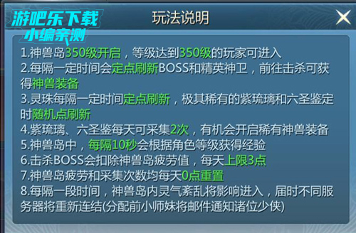 1、开启等级:单服神兽岛 330 级开启,跨服神兽岛 350 级开启;