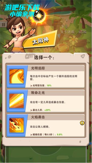太阳神技能是光、火系攻击技能,是前期优先选择的神,特有的追踪技能,对攻击者造成额外的伤害,全屏追踪,十分爽快。