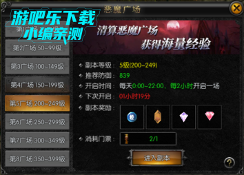 进入恶魔广场需消耗恶魔广场通行证,玩家可以在合成处通过材料合成,材料来源广泛,无须担心。恶魔广场内会不停刷新怪物,击杀完当前波数所有怪物后可刷新下一波怪物,击杀怪物越多将额外获得经验奖励。