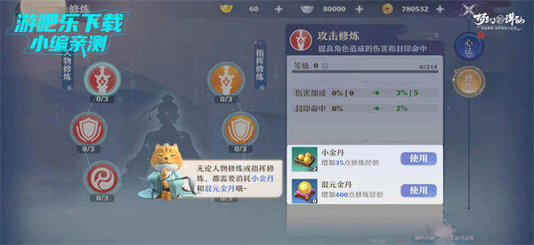 消耗小金丹、混元金丹研习对应修炼,则可提升角色或灵兽、仙友的对应属性。