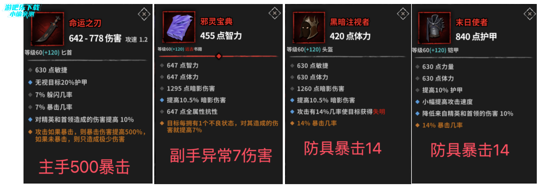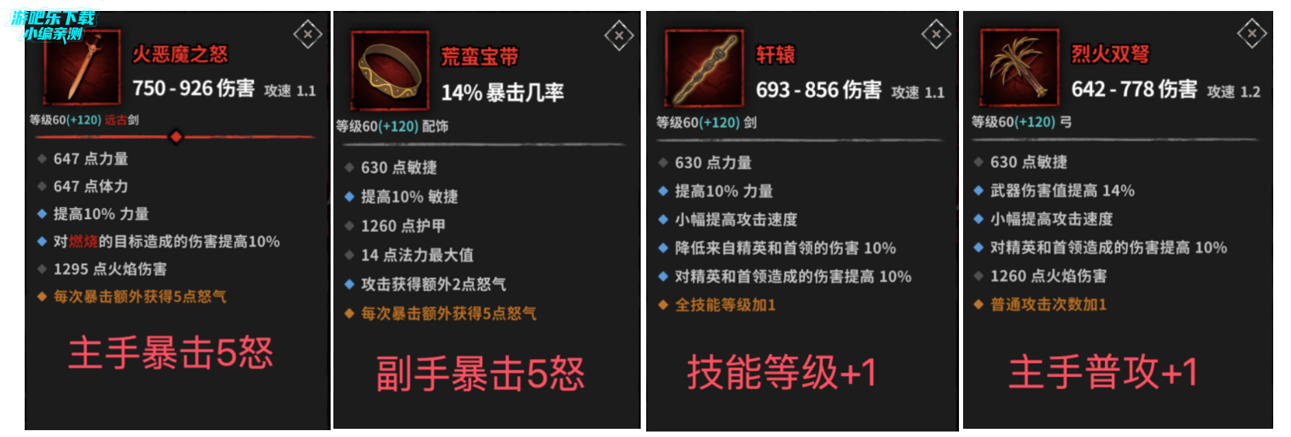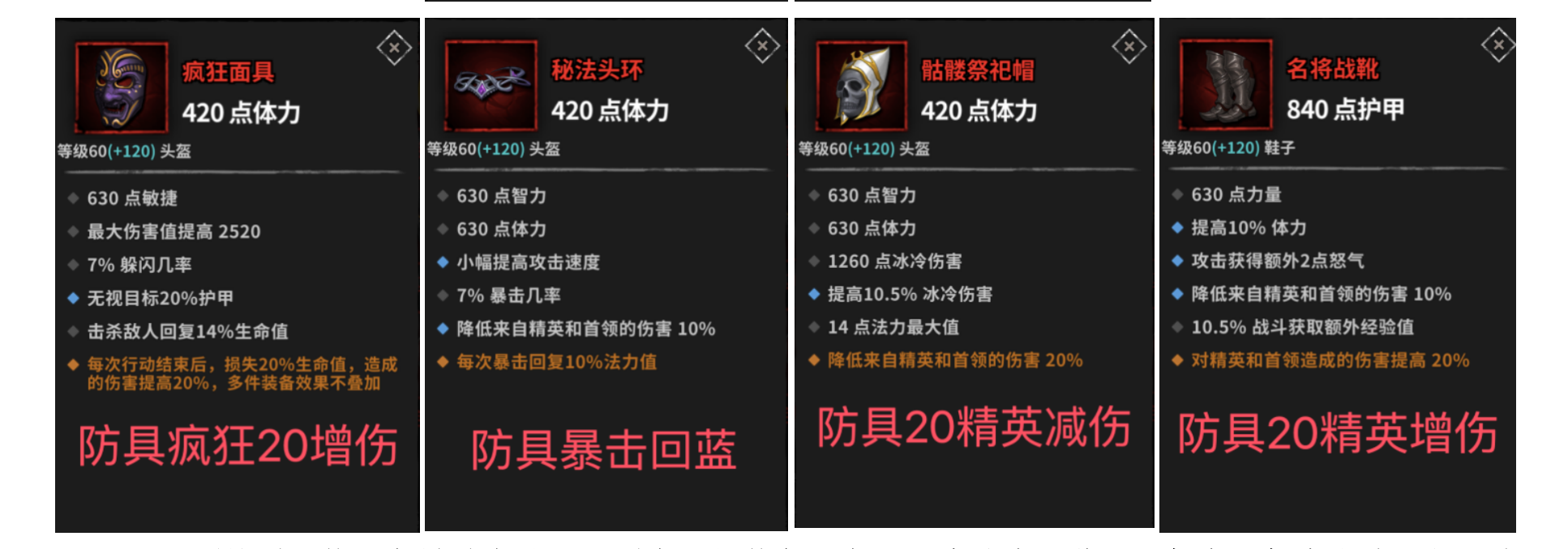 红色装备是游戏前期属性和伤害重要的提升途径,此处重点说下要保留的词条属性(主手暴击回5怒、副手暴击回5怒、主手全技能等级+1、主手普攻+1、主手500暴击、副手每种异常属性7%伤害、防具暴击14%、防具20%疯狂增伤、防具暴击回蓝、防具20%精英减伤、防具20%增伤、装备词条21%经验加成的),下面只列举部分主要的装备图。(加粗有下划线的必须留,很有用)
