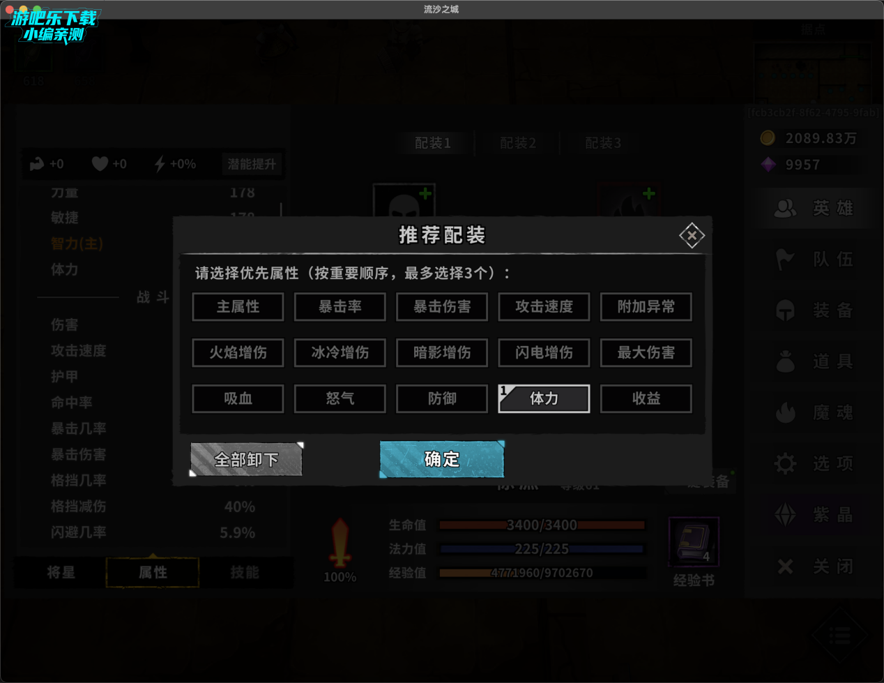 新手期穿垃圾装备可以直接用一件装备,里面选一条属性直接穿戴,例如前期工具人都带体力属性,就勾选体力一键穿戴,细节得需要自己单独对个别装备进行调整,自己体会吧。