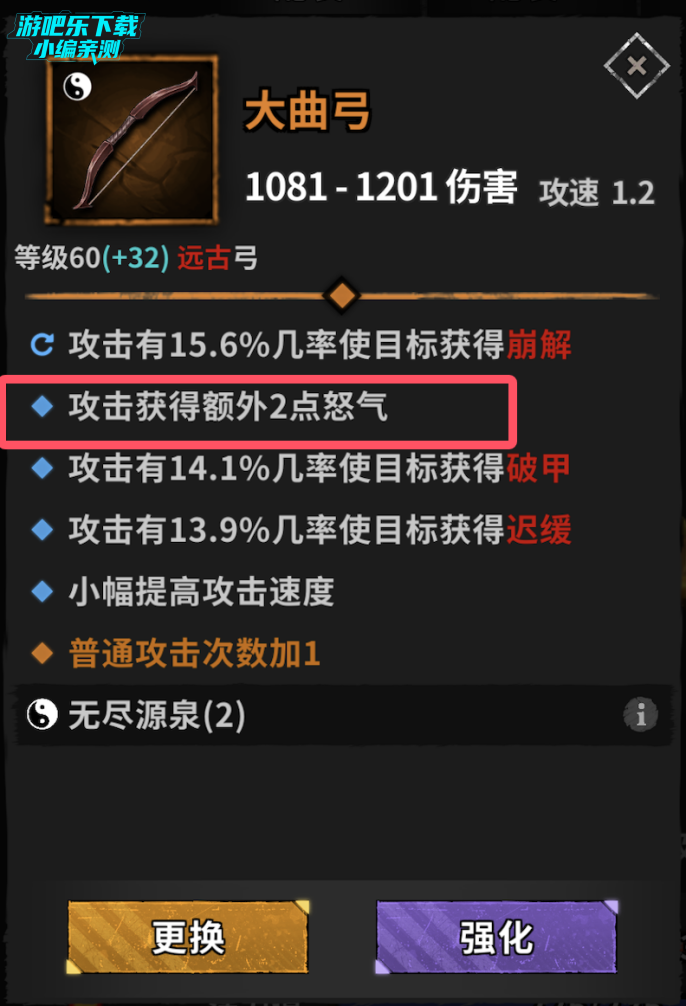 (3)辅助类:狂怒斗士(越多越好,方便60级了互相搭配过周目BOSS)、无尽源泉(最少2件搭配无限黄忠使用)。