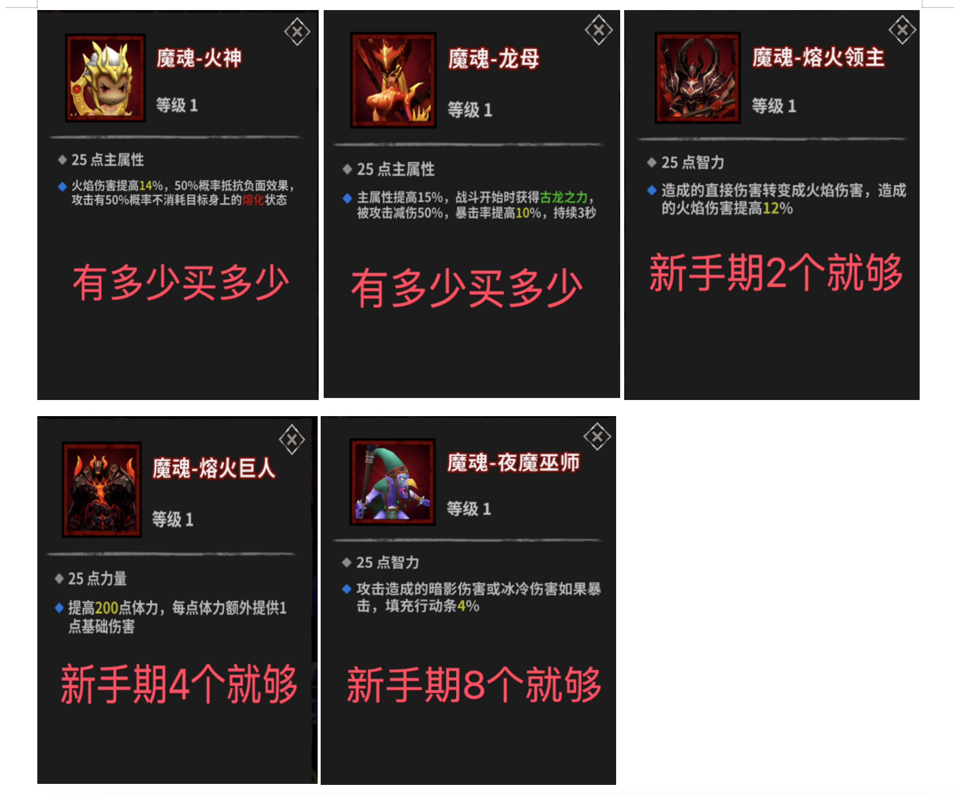 新手期到手的魔魂不要着急去给用魔草升级,就白板先带着用,等后面魔魂材料多了需要升星合成了再升级。累计7天签到一定要选火神,你玩一玩就会发现火神太缺了。