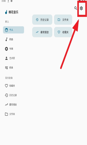 1、打开棉花音乐APP,点击屏幕右上角的设置图标。