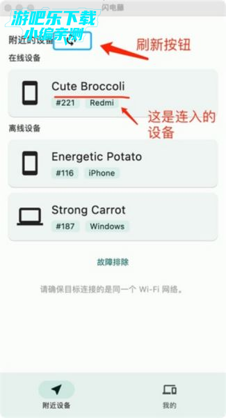 首先连接两个设备,当两个闪电藤/localsend启动时,并且他们在同一个局域网时,就能自动发现他们,如果发现不了,就点刷新按钮刷新一下。