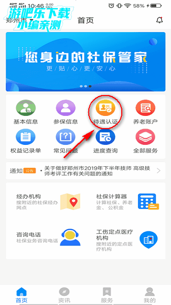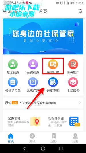 打开河南社保app,先登录账号,然后在“首页”点击“待遇认证”;