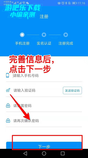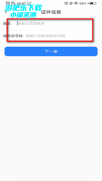 在“证件信息”输入认证人员的姓名和身份证号码,点击“下一步”;