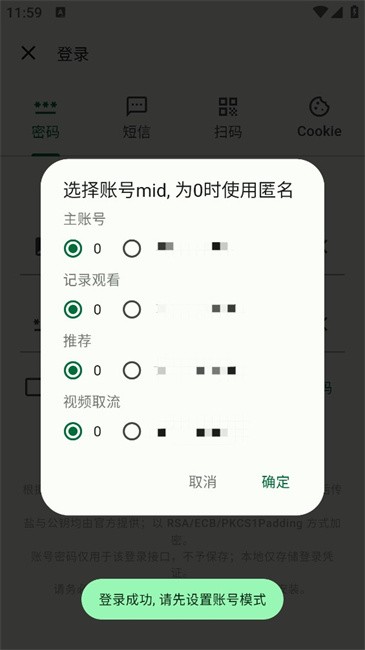 4、登录后选择账号mid点击确定;或是不选择,为0时使用匿名