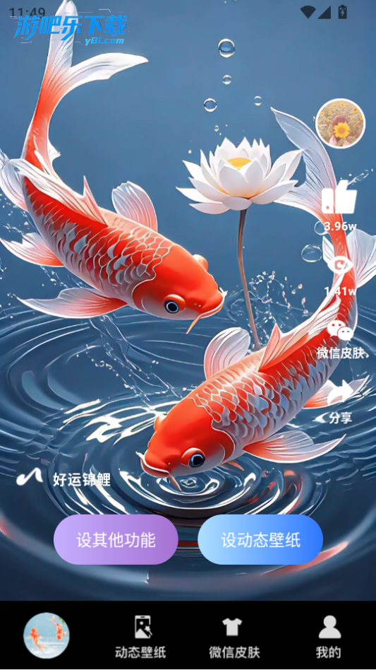 - 界面简洁明了,设置壁纸超级方便,点几下就搞定了。特别惊喜的是还能设置成微信和QQ的皮肤,让聊天界面都变得生动起来。鱼儿游得很自然,手机桌面瞬间治愈了不少,对于追求个性化的用户来说是个不错的选择。