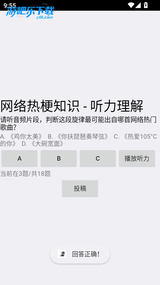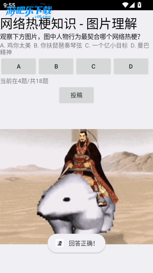 网络梗考试软件手机版是一款以网络热梗为主要内容的答题软件。玩家只需点击屏幕选择正确答案即可。其题库丰富,涵盖不同领域的网络热梗,题目类型多样化。感兴趣的朋友可以来试试!