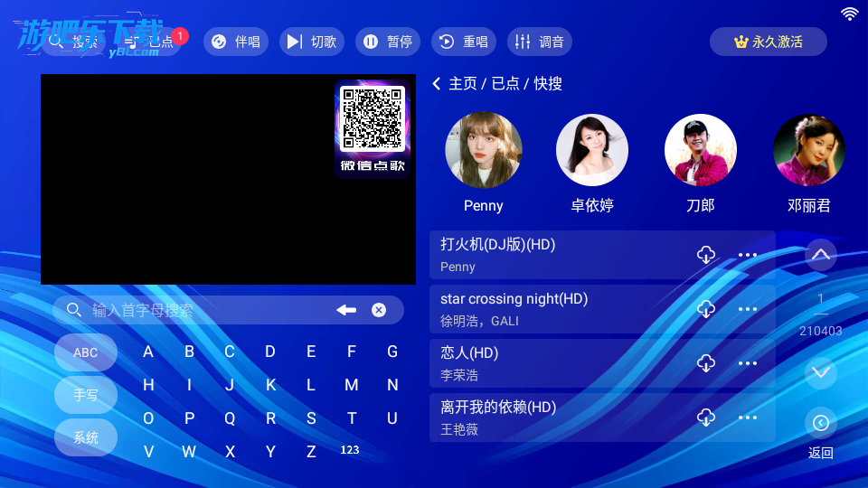 进入蓝调KTV软件,这里可以用各种方式进行点歌