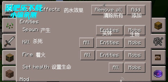 11、Kill栏,我们能选择要杀死的生物或者实体,或者是将地图中的所有物品清除。