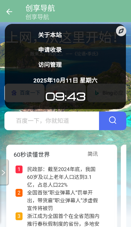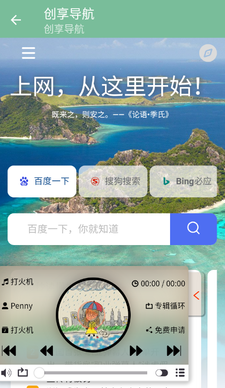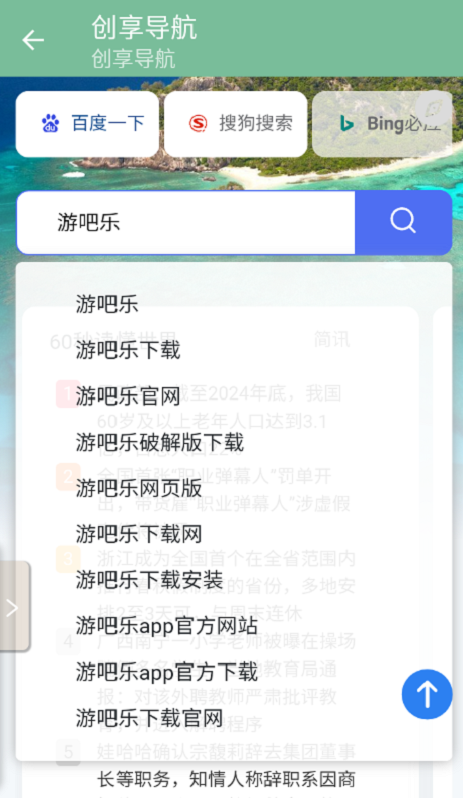 创享导航app是一款极致轻量、操作简便的综合资源导航工具。它整合了浏览器、网盘、影视、小说、音乐等多元内容,实现一站式资源获取与娱乐。用户无需注册登录,即可通过清晰的分类和精准搜索,高效直达各类资源核心内容,快速享受影音娱乐,是满足多样化需求的便捷选择。