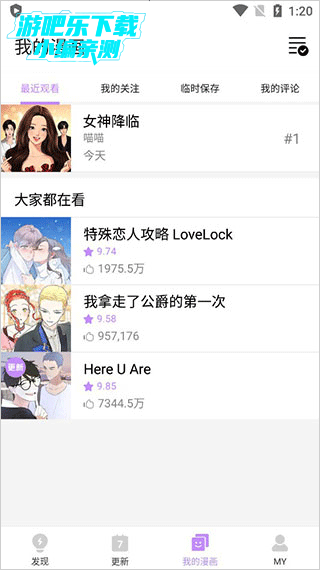 5、切换到我的漫画,可以看到我最近看的漫画,以及我的关注、临时保存、我的评论内容。